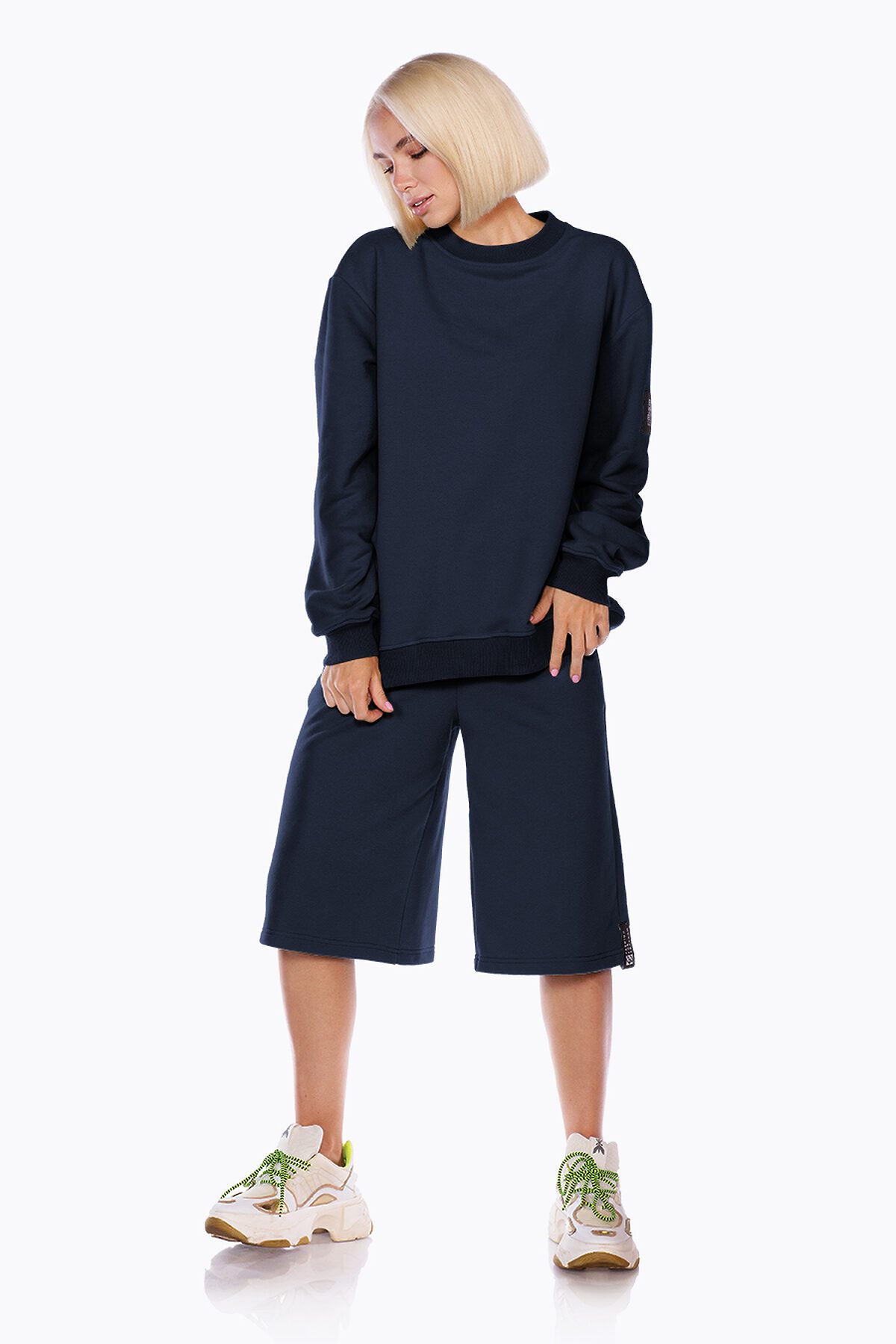 Модель оверсайз, со спущенной линией плеча, удлиненная по спинке. Горловина, манжеты и низ изделия выполнены из качественного эластичного материала в рубчик. Декорирована контрастным кожаным лейблом и жаккардовым шевроном с QR кодом на плече.
