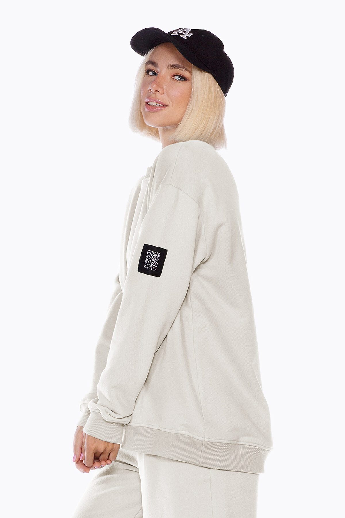Модель оверсайз, со спущенной линией плеча, удлиненная по спинке. Горловина, манжеты и низ изделия выполнены из качественного эластичного материала в рубчик. Декорирована контрастным кожаным лейблом и жаккардовым шевроном с QR кодом на плече.