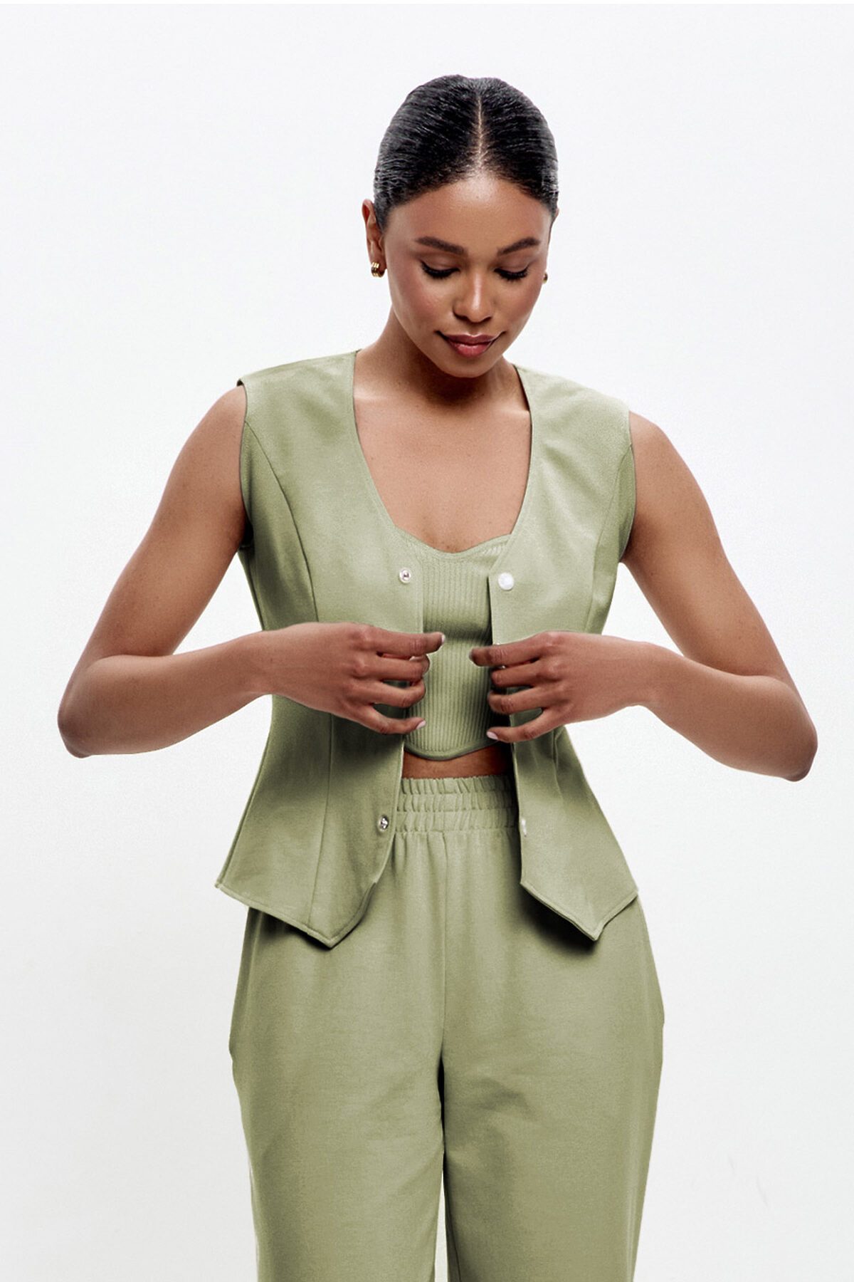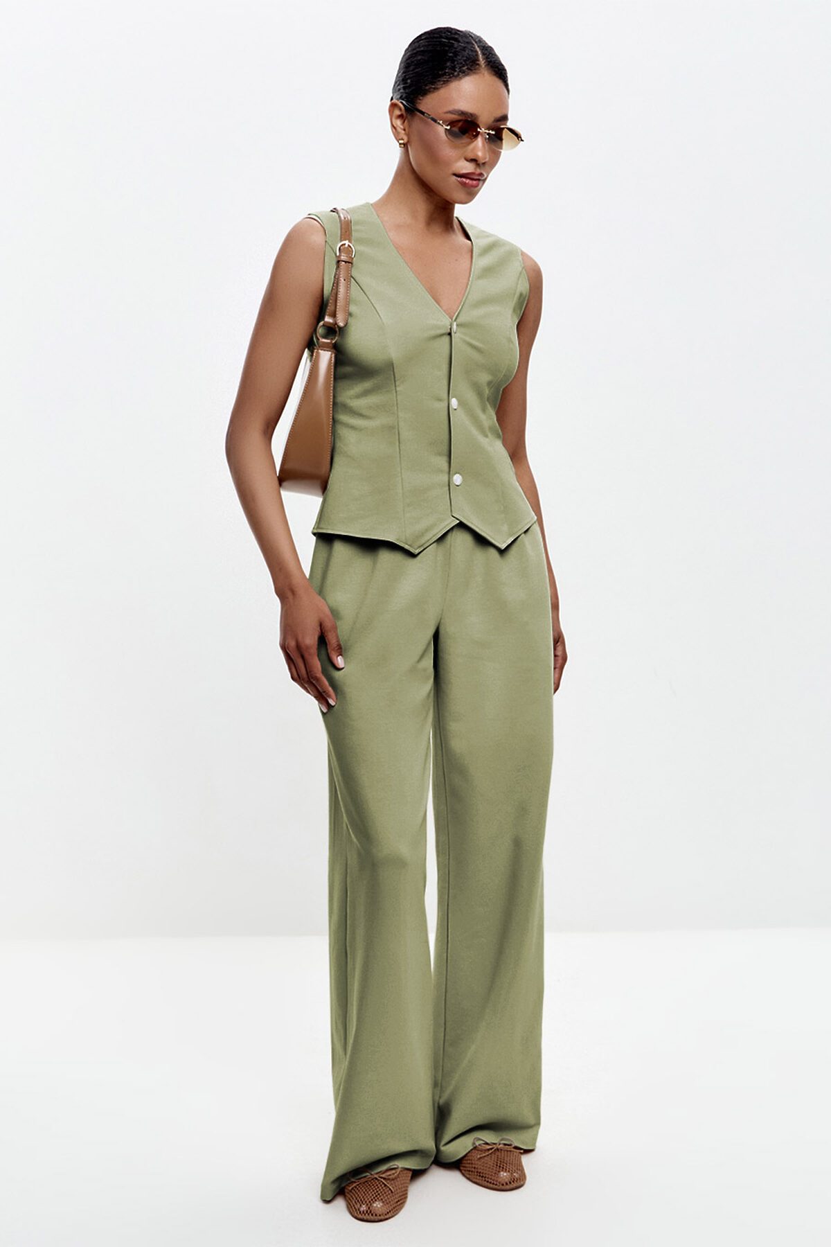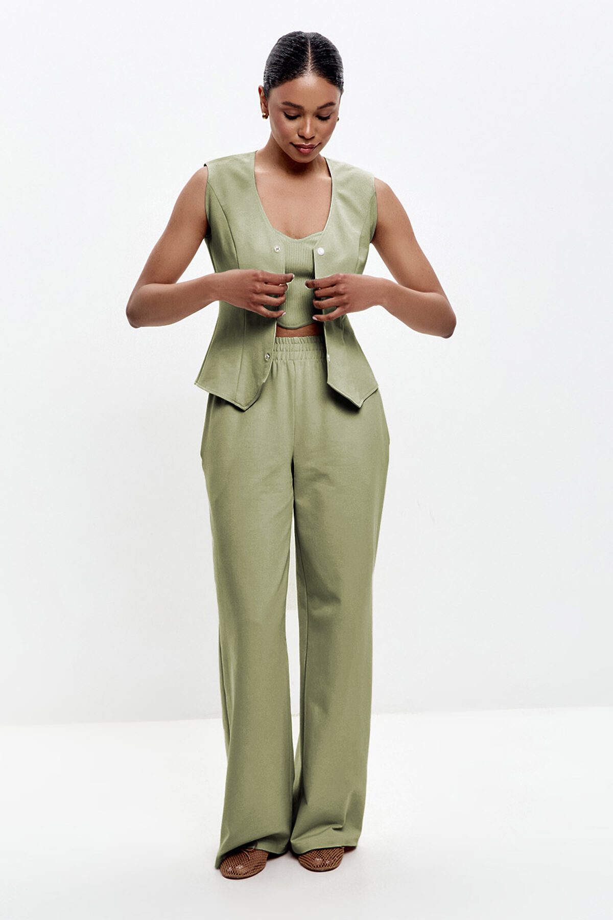 Тренд сезона - широкие брюки на высокой талии с приталенным жилетом. Жилет приталенного полуприлегающего кроя, без рукава, с застежкой на кнопки, спинка на регулирующейся ленте.