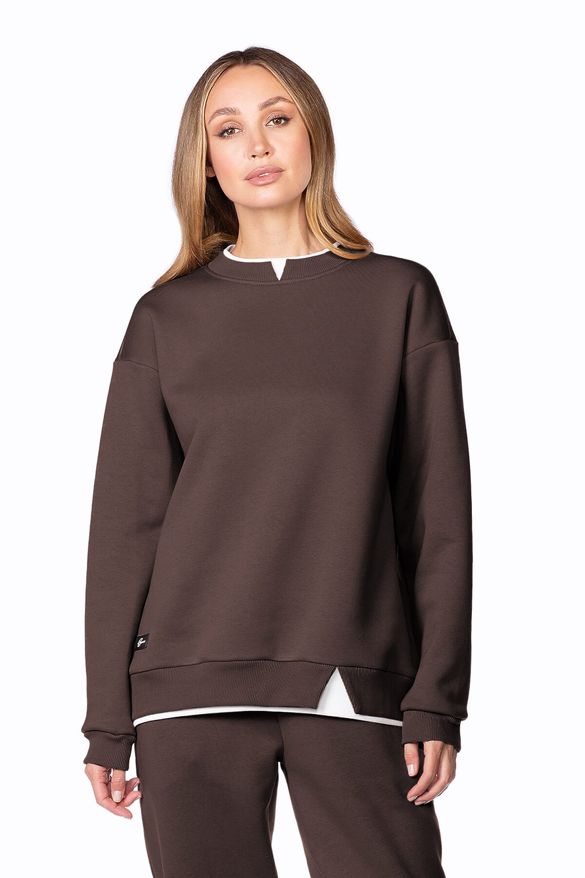 Утепленный женский свитшот свободного кроя с круглым вырезом горловины. Низ свитшота из горловина из эластичного фактурного кашкорсе, продублированного контрастной белой вставкой, имитирующей выглядывающую футболку снизу.