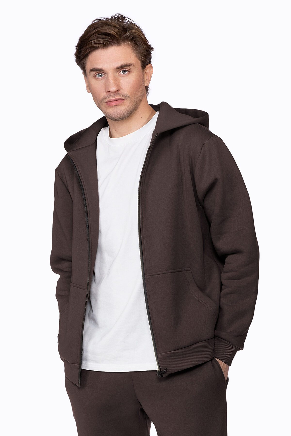 Толстовка прямого кроя, с втачным рукавом и объемным капюшоном, с застежкой на оригинальную витую молнию с прорезиненным черным покрытием. Модель с карманом кенгуру, декорированным именным шевроном с логотипом Ezanna. Манжет и низ изделия выполнен из качественного эластичного материала в рубчик.