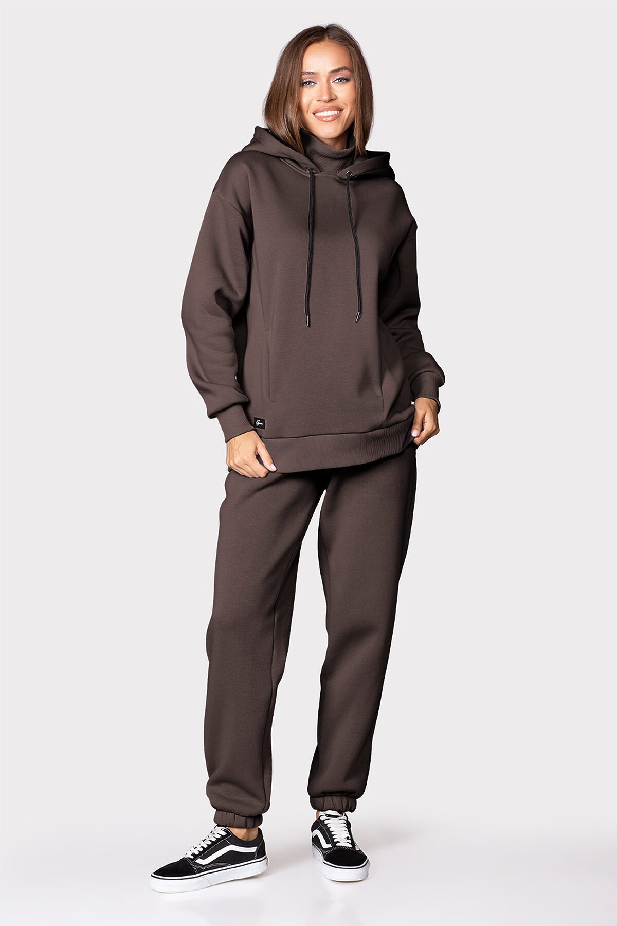 Худи свободного кроя, немного удлиненно, со спущенной линией плеча. Объемный капюшон со шнурами в дуэте с высоким воротом - идеальный вариант против ветра, холода и непогоды. Декорировано оригинальными боковыми швами с функциональными карманами. Манжет и низ изделия выполнены из качественного эластичного материала в рубчик.