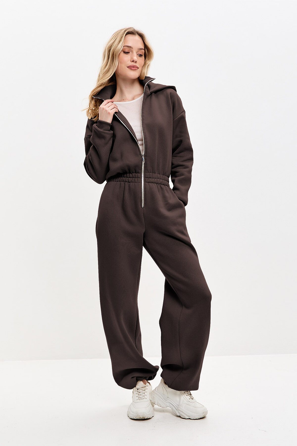 Стильный утепленный комбинезон для активного отдыха и прогулок. Комбинезон с высоким воротом и объемным капюшоном, широкого кроя, приталенного силуэта, на разъемной молнии.