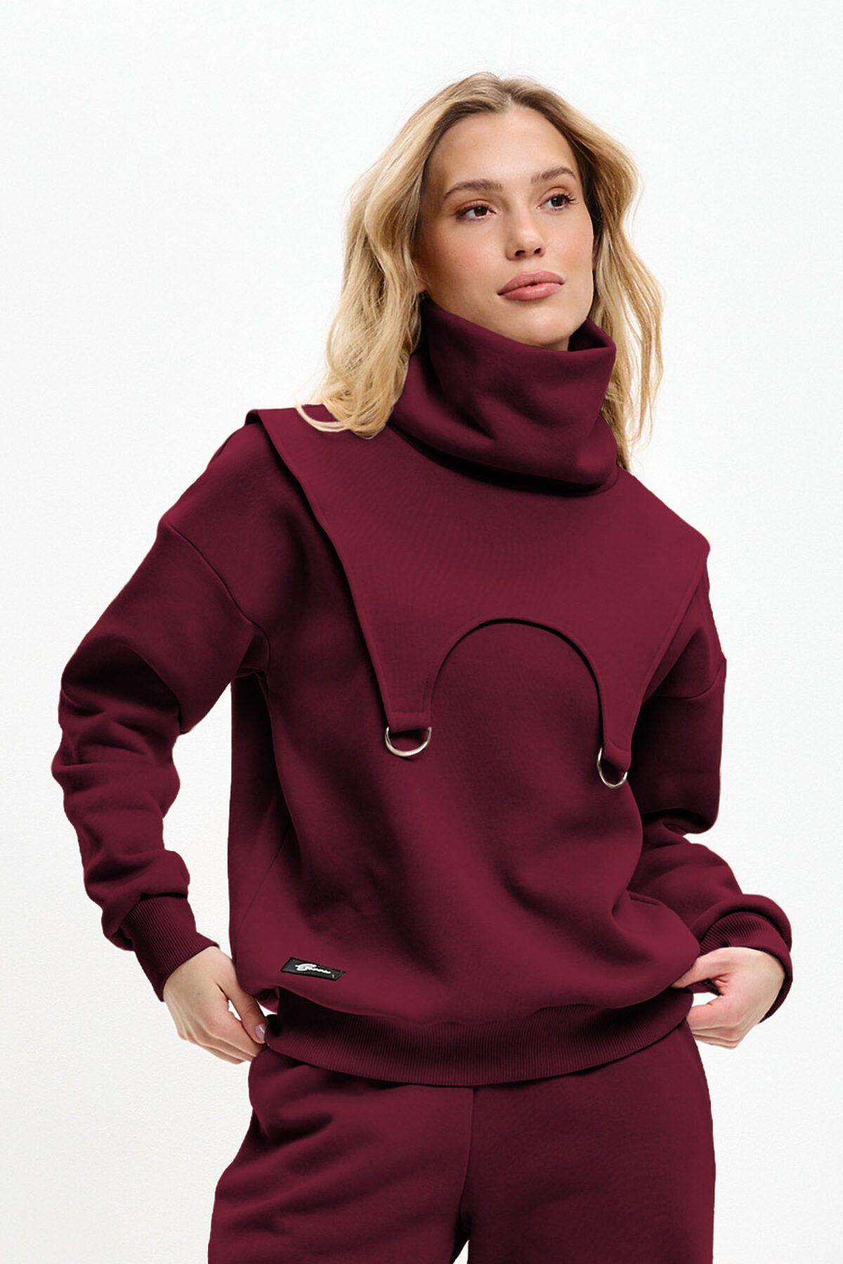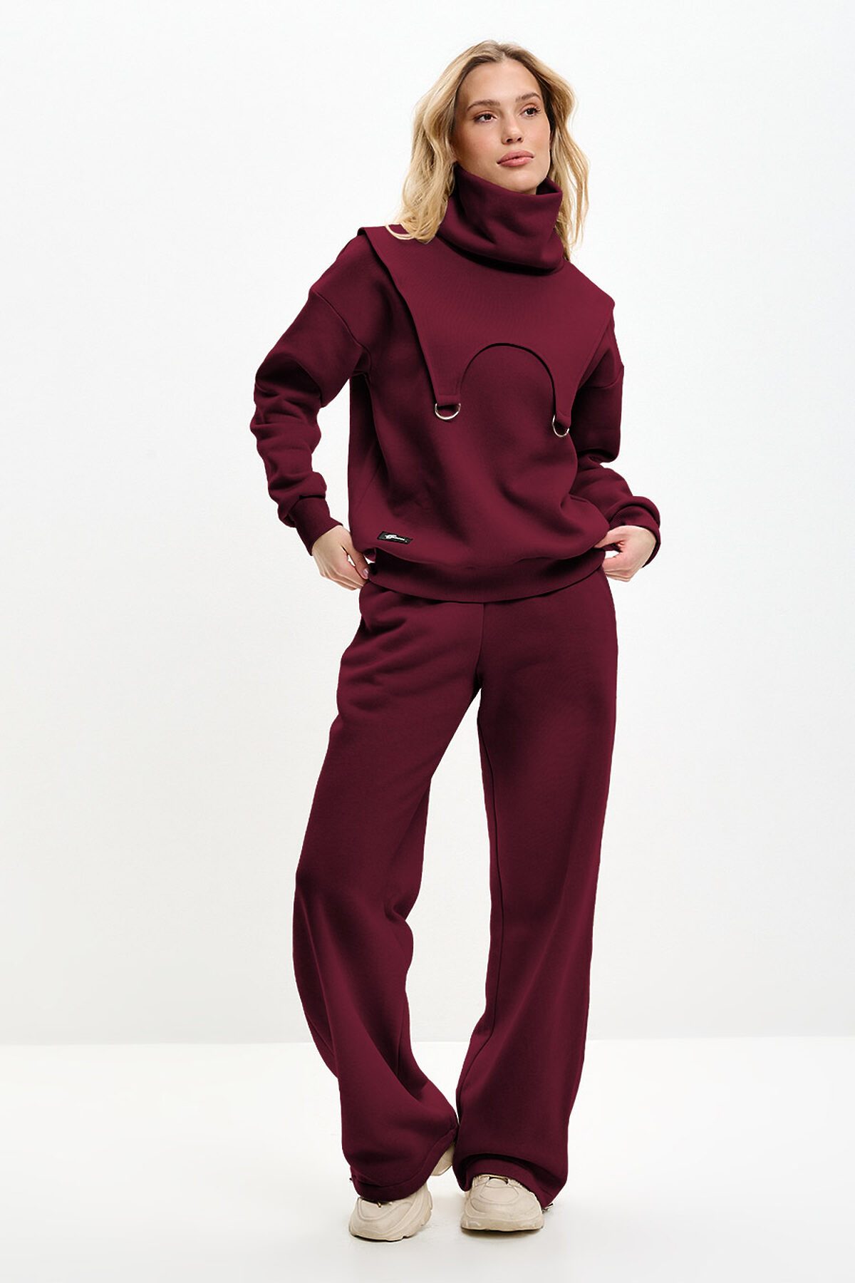 Костюм трансформер состоит из свитшота, брюк и снуда. Снуд съемный, можно использовать вместо шарфа. Свитшот оверсайз, со спущенной линией плеча. Горловина необычной треугольной форсы, манжеты и низ изделия выполнены из качественного эластичного материала в рубчик.