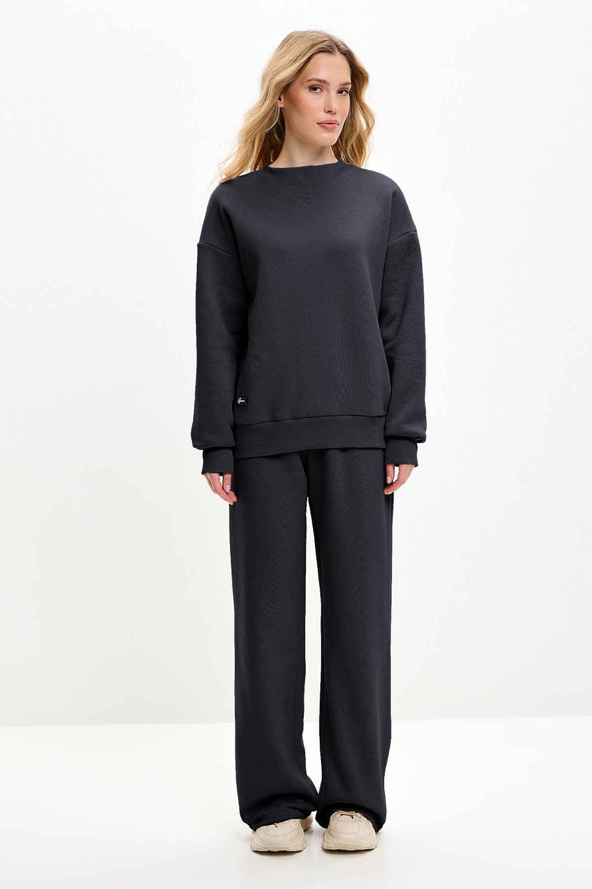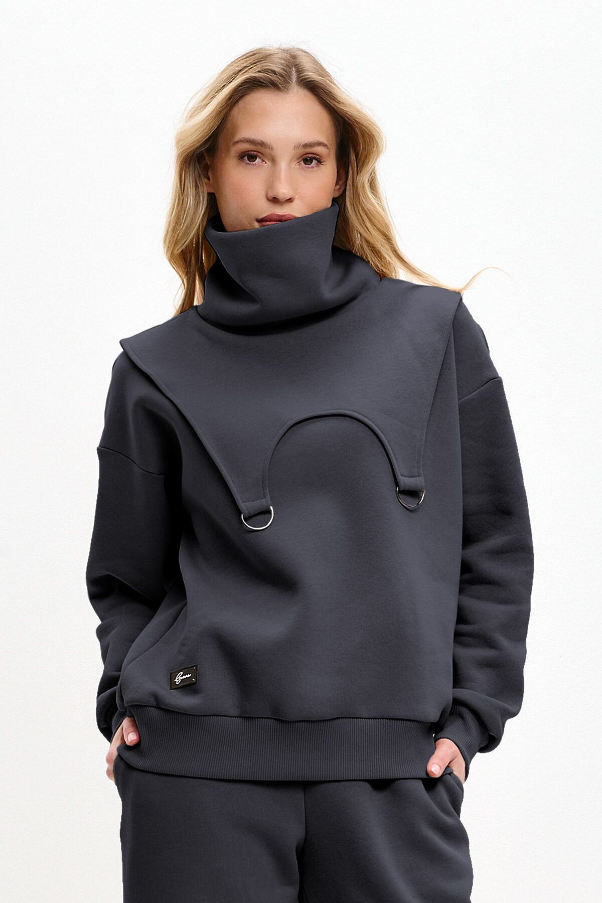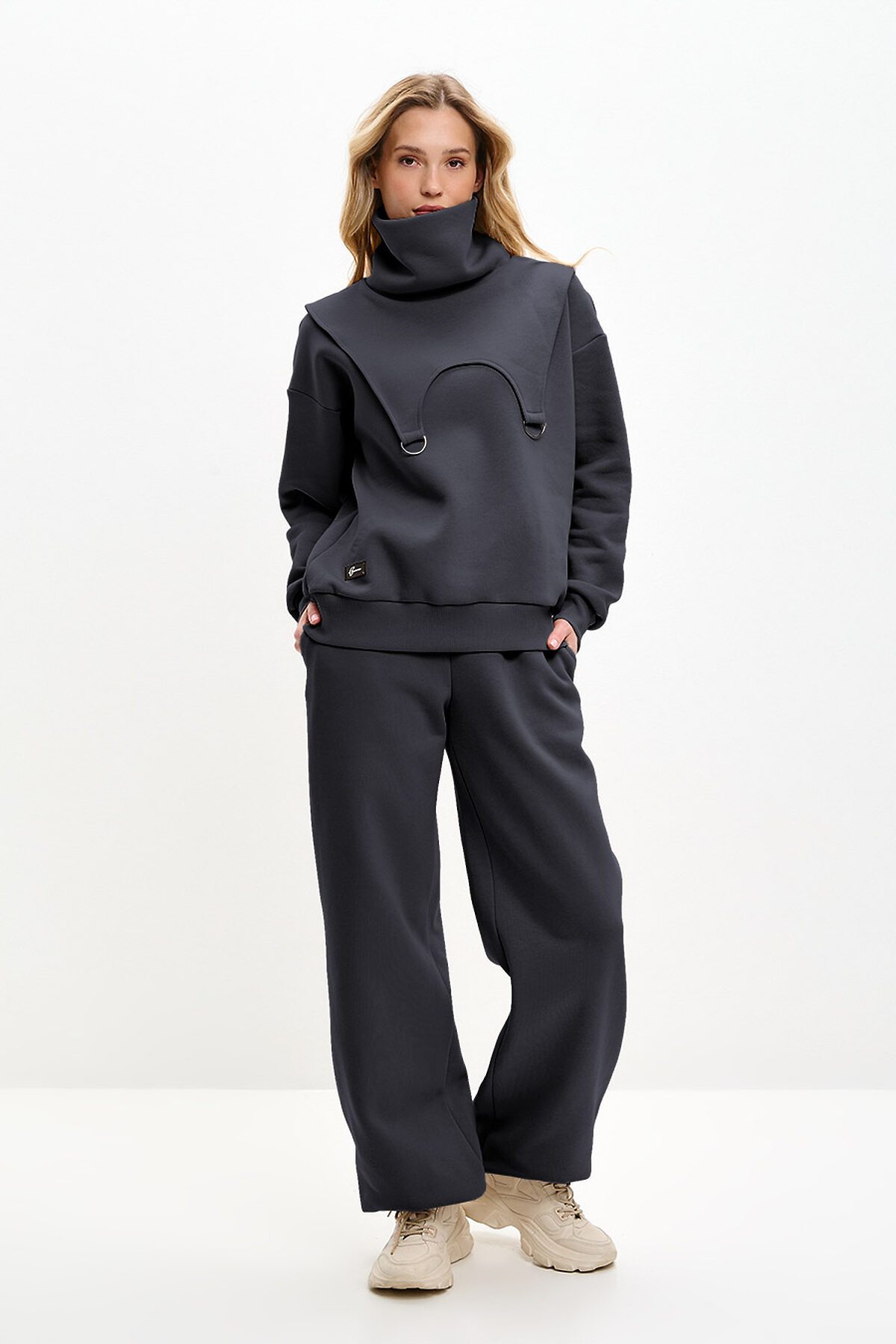 Костюм трансформер состоит из свитшота, брюк и снуда. Снуд съемный, можно использовать вместо шарфа. Свитшот оверсайз, со спущенной линией плеча. Горловина необычной треугольной форсы, манжеты и низ изделия выполнены из качественного эластичного материала в рубчик.