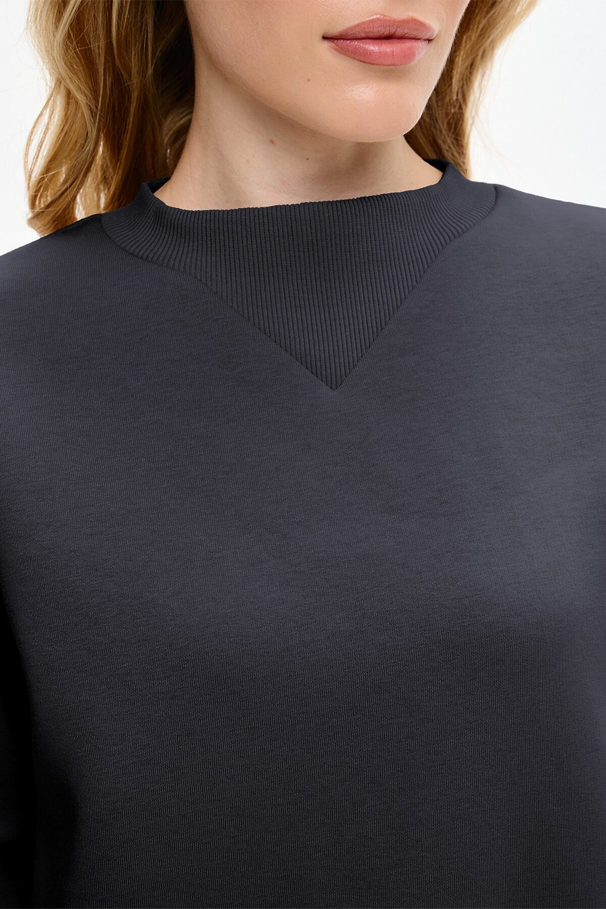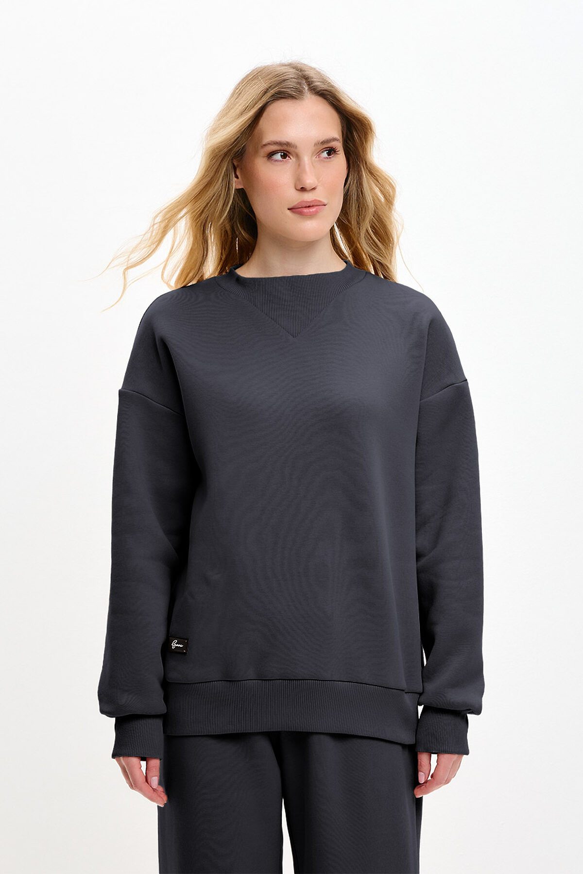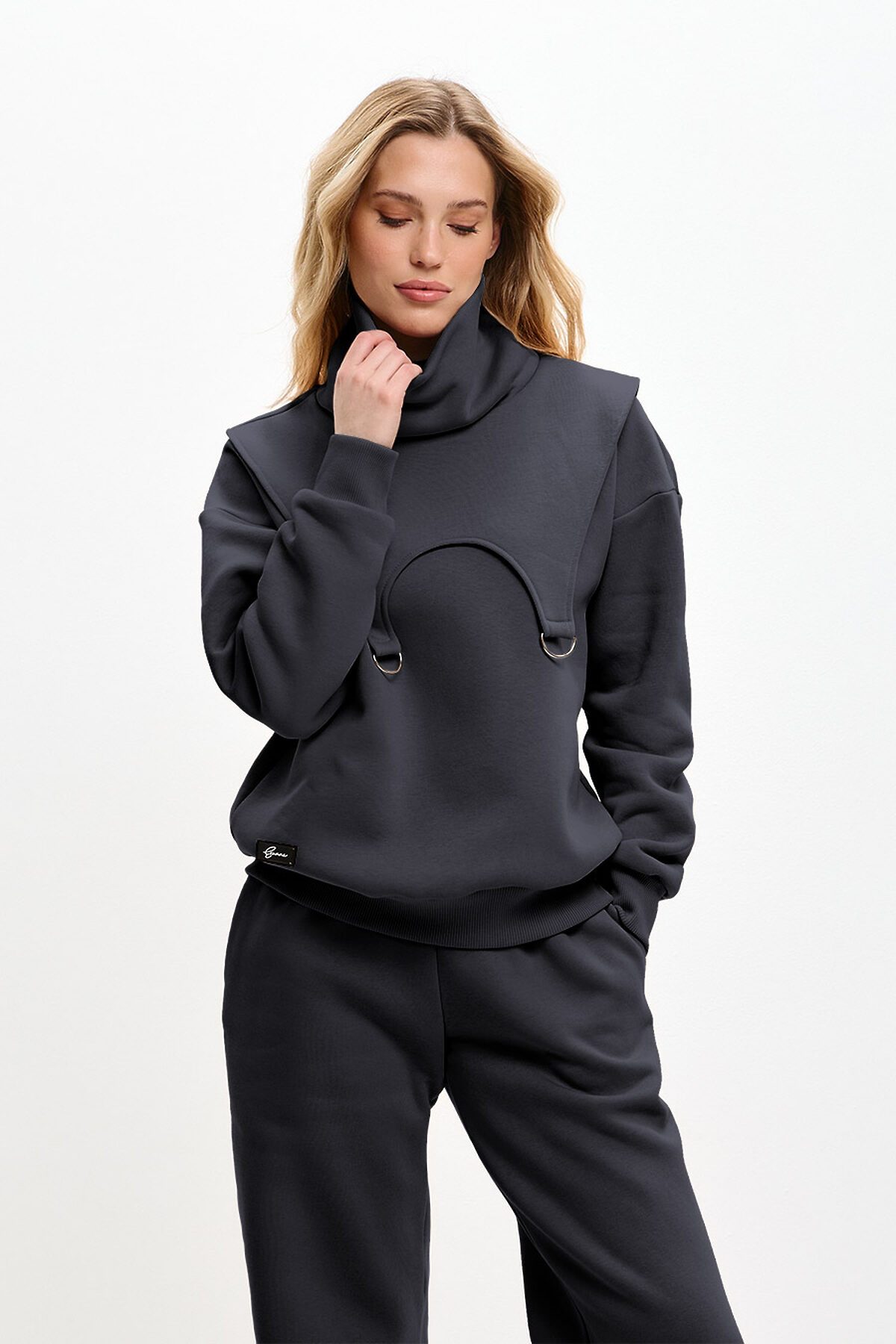 Костюм трансформер состоит из свитшота, брюк и снуда. Снуд съемный, можно использовать вместо шарфа. Свитшот оверсайз, со спущенной линией плеча. Горловина необычной треугольной форсы, манжеты и низ изделия выполнены из качественного эластичного материала в рубчик.