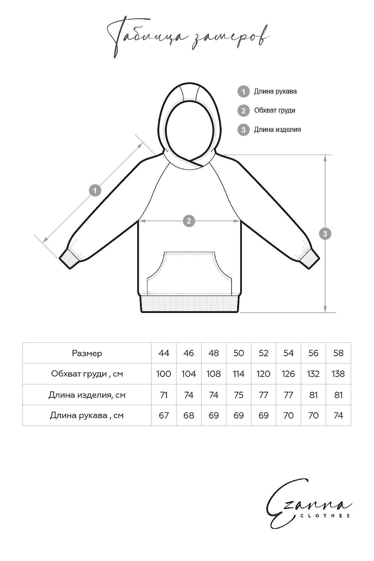 Модель прямого кроя, с втачным рукавом. Объемный капюшон и карман-кенгуру, с именным шевроном с логотипом Ezanna. Манжет и низ изделия выполнен из качественного эластичного материала в рубчик.