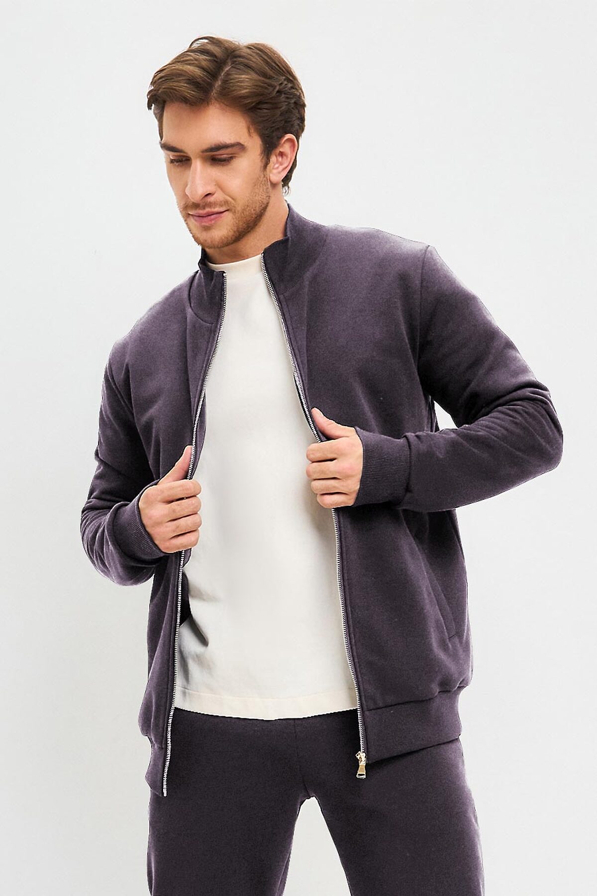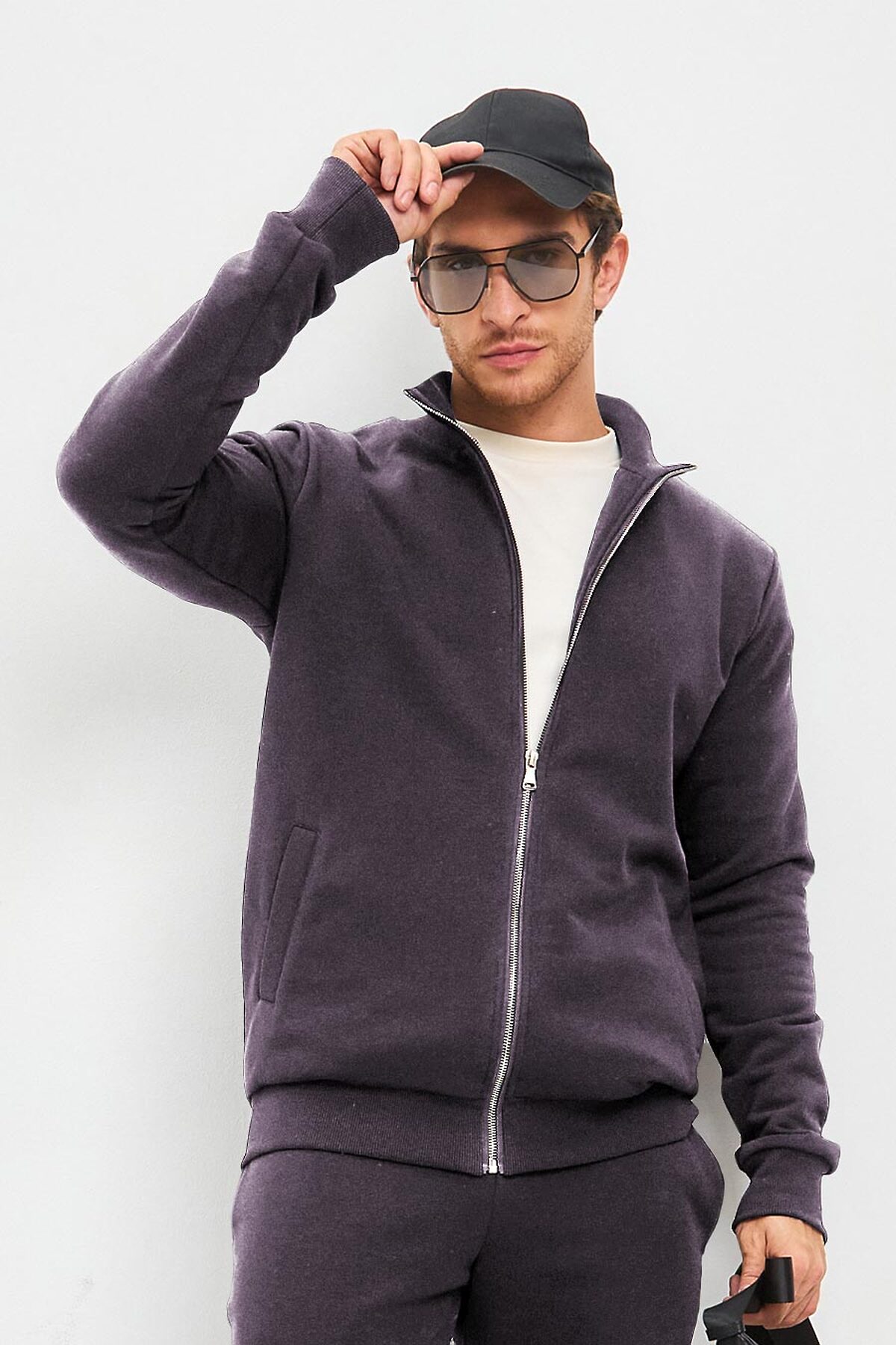 Толстовка прямого кроя, с втачным рукавом и воротом стойкой, с застежкой на металлическую молнию. Модель с боковыми прорезными карманами. Манжеты, ворот и низ изделия выполнен из качественного эластичного материала в рубчик.