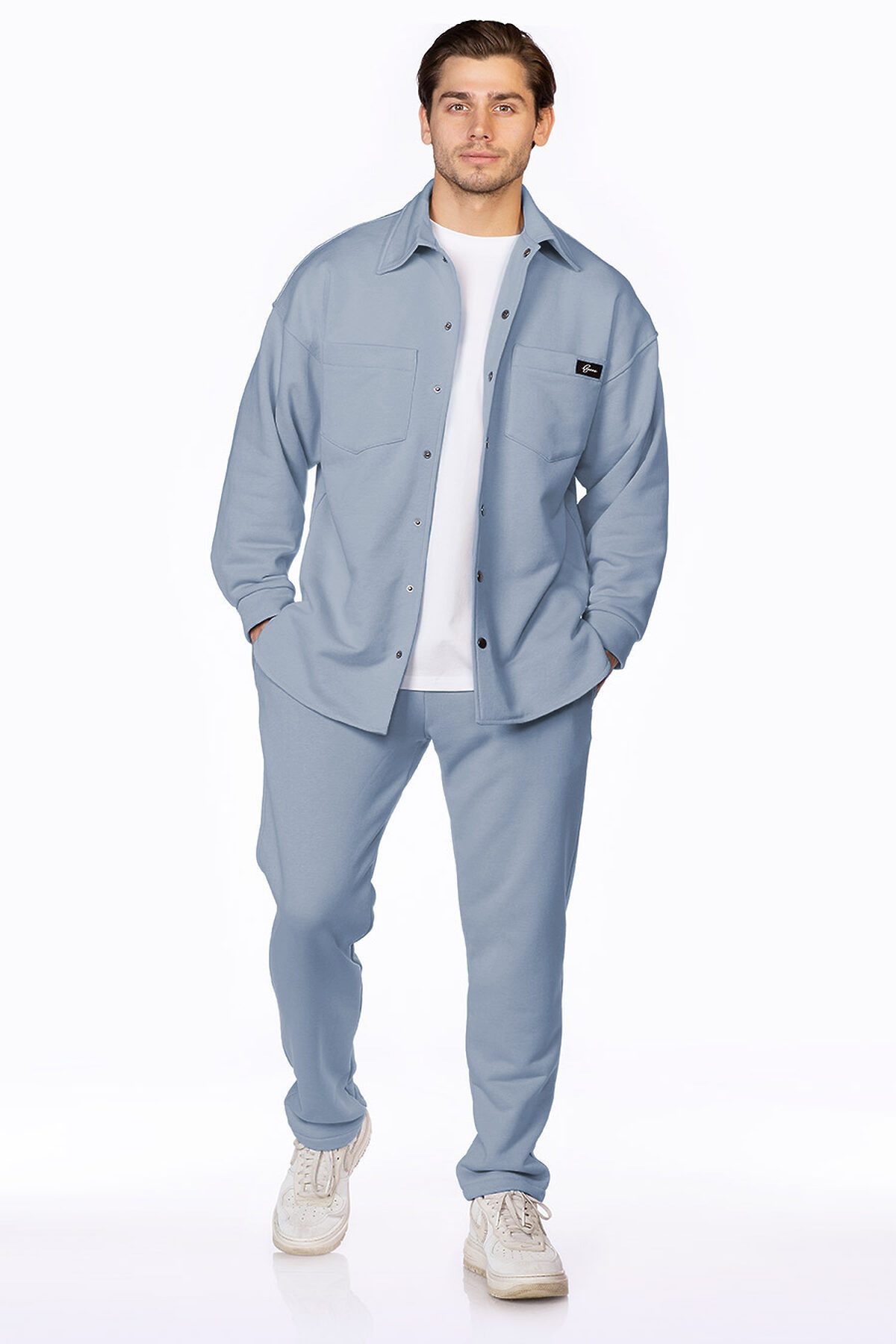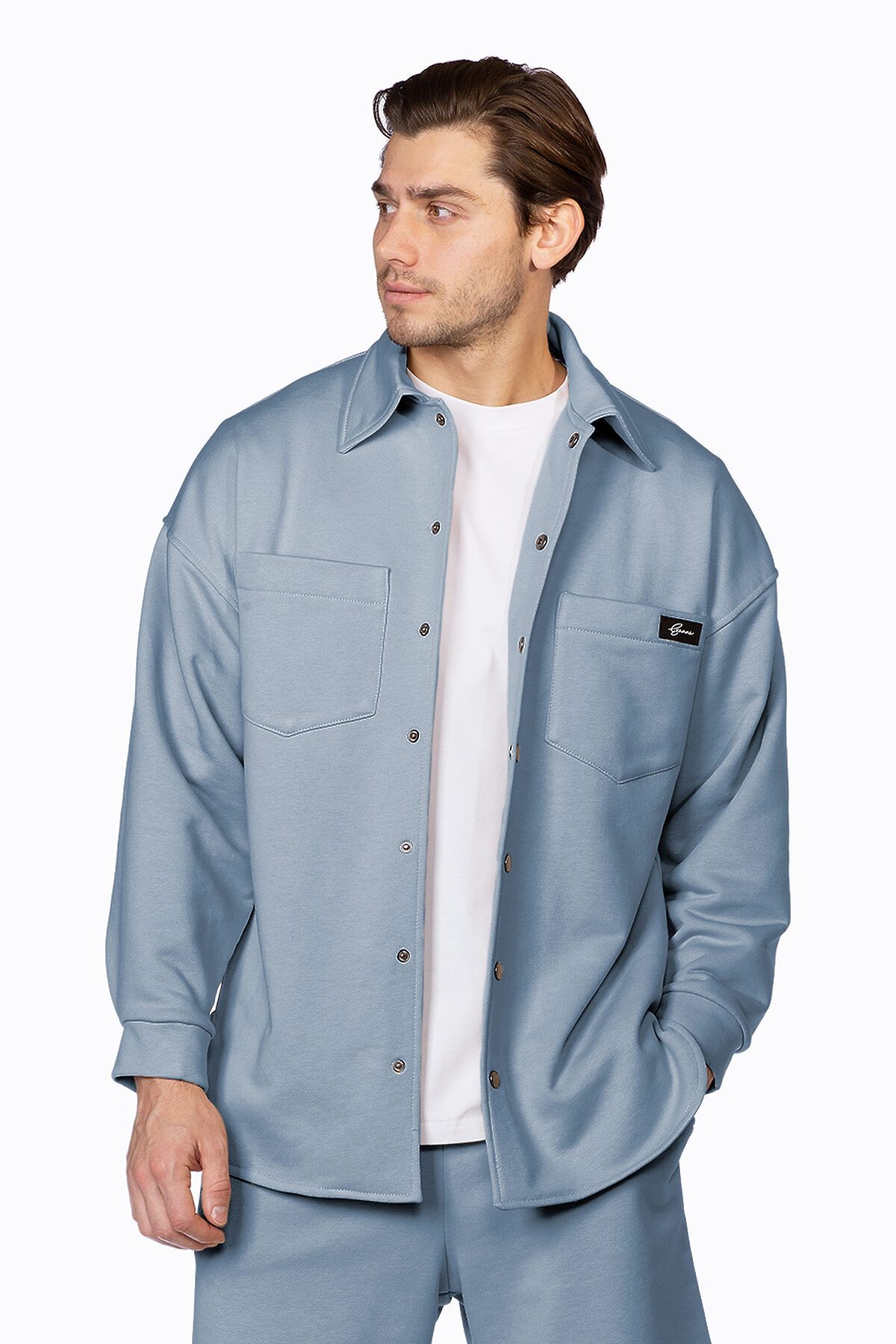 Рубашка свободного кроя, со спущенной линией плеча, застегивается на кнопки. Накладные карманы без клапана, декорированы именным шевроном с логотипом Ezanna. Брюки прямого без манжетов по низу, чуть зауженного кроя, пояс выполнен из эластичного кашкорсе, удобные боковые карманы.