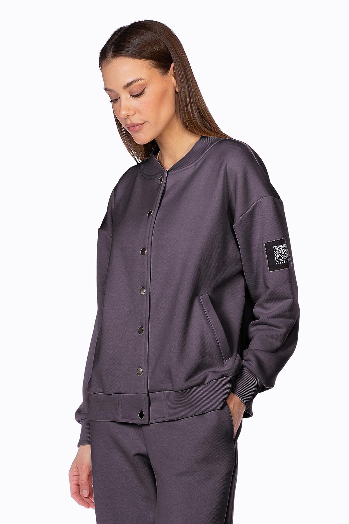 Модель свободного кроя, с втачным рукавом, декорированным жаккардовым именным шевроном QR-код. Бомбер застегивается на кнопки, с удобными боковыми карманами. Низ изделия, манжеты и ворот выполнены из эластичного фактурного материала.