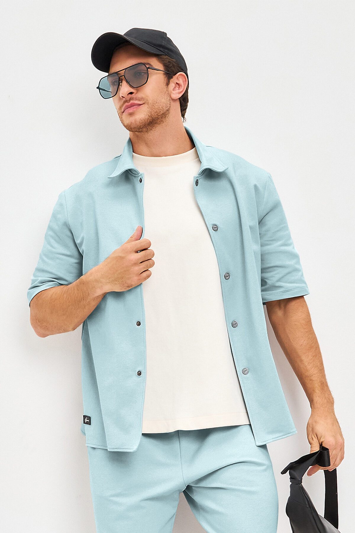 Рубашка свободного кроя, с рукавом до локтя и отложным воротником. Застегивается на кнопки.