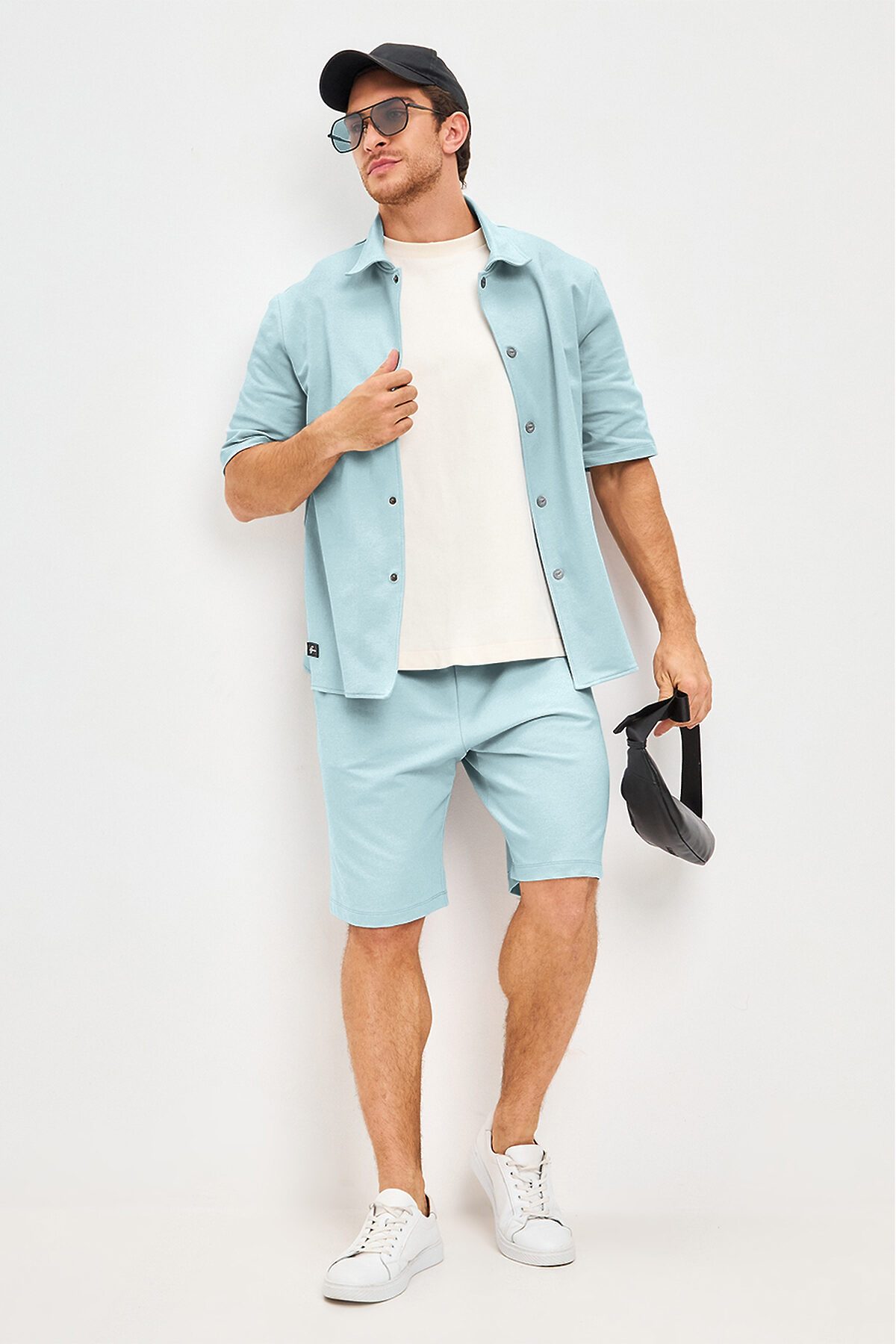 Шорты свободного кроя, длиной до колена. Пояс выполнен из эластичного фактурного материала, удобные боковые карманы и декоративная брендированная петля с логотипом Ezanna. Низ шорт обработан резанным краем, что подчеркивает расслабленный и повседневный стиль костюма.