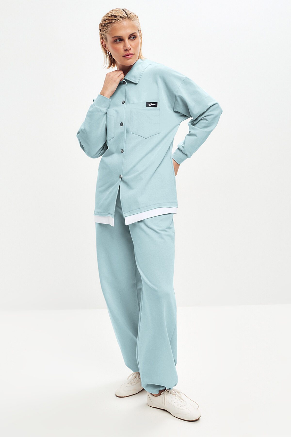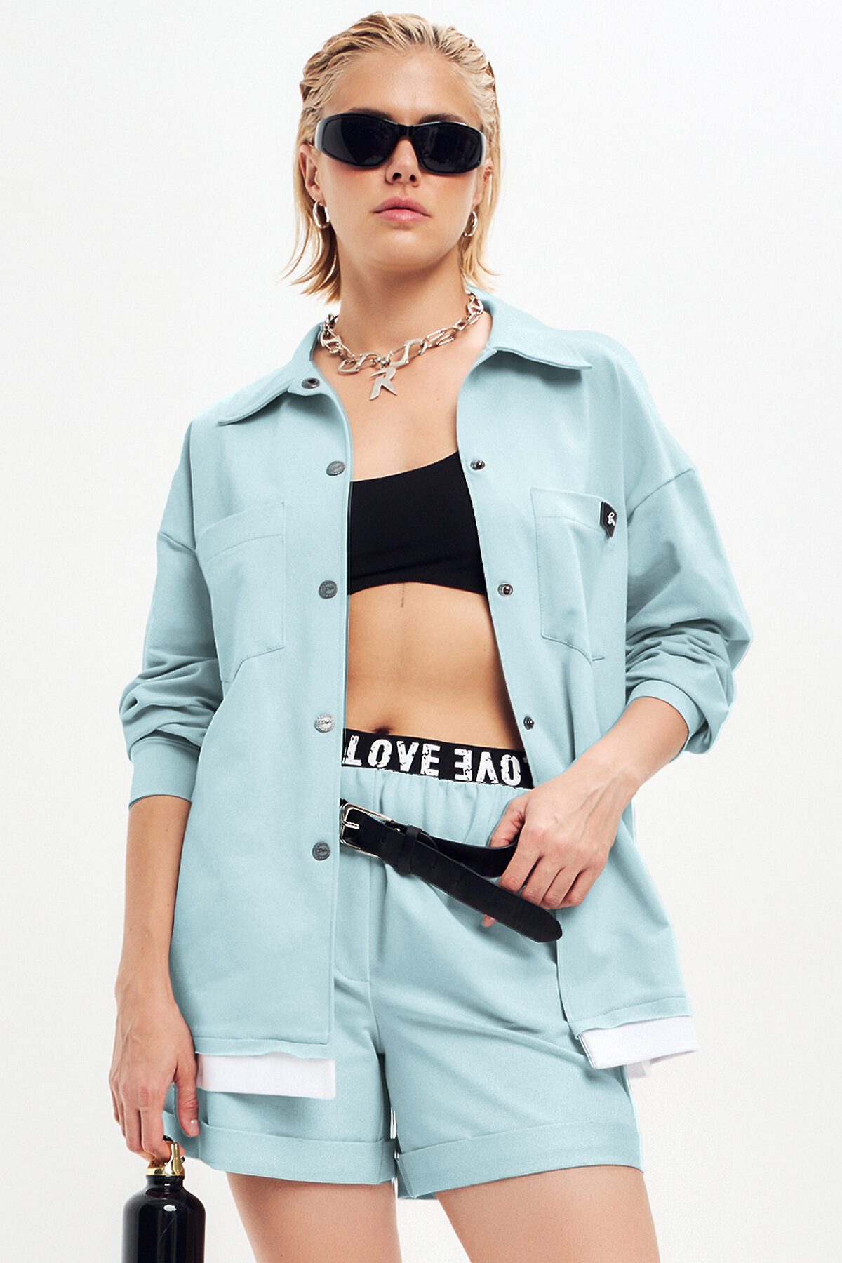 Рубашка свободного кроя, со спущенной линией плеча, застегивается на кнопки. Накладные карманы без клапана, декорированы именным шевроном с логотипом Ezanna. Белая полоска по низу, имитирующая выглядывающую футболку.