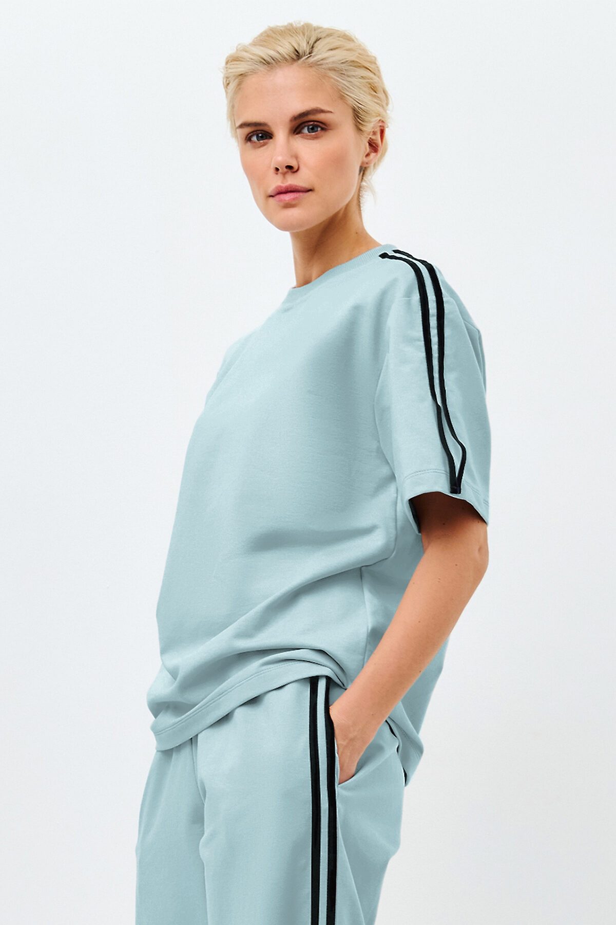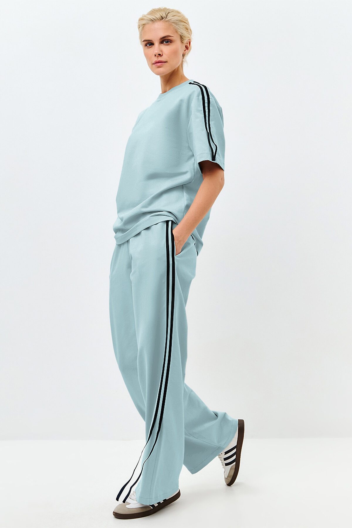 Тренд сезона - широкие брюки на высокой талии с футболкой оверсайз. Футболка оверсайз, с круглым вырезом горловины. Брюки свободного кроя, с широким поясом из основной ткани, удобные боковые карманы.