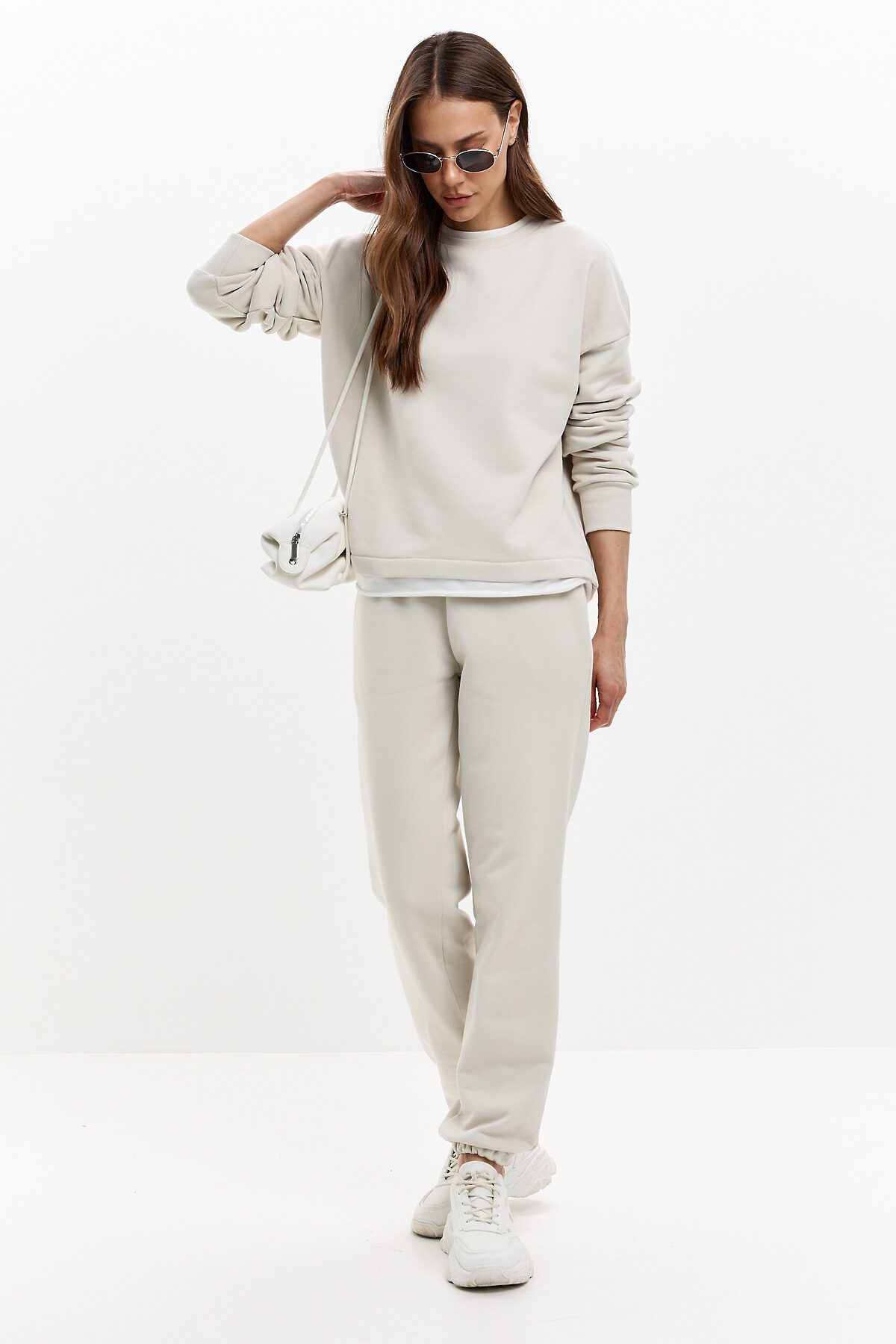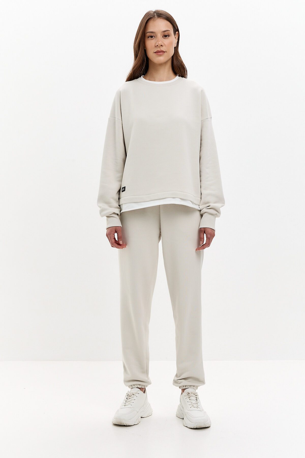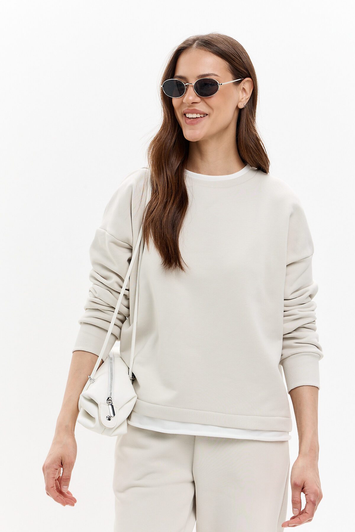 Модель оверсайз, со спущенной линией плеча. Контрастная белая горловина и дублирующая белая полоска по низу имитирует многослойность. Горловина и манжеты изделия выполнены из качественного эластичного материала в рубчик. Очень комфортная и универсальная модель.