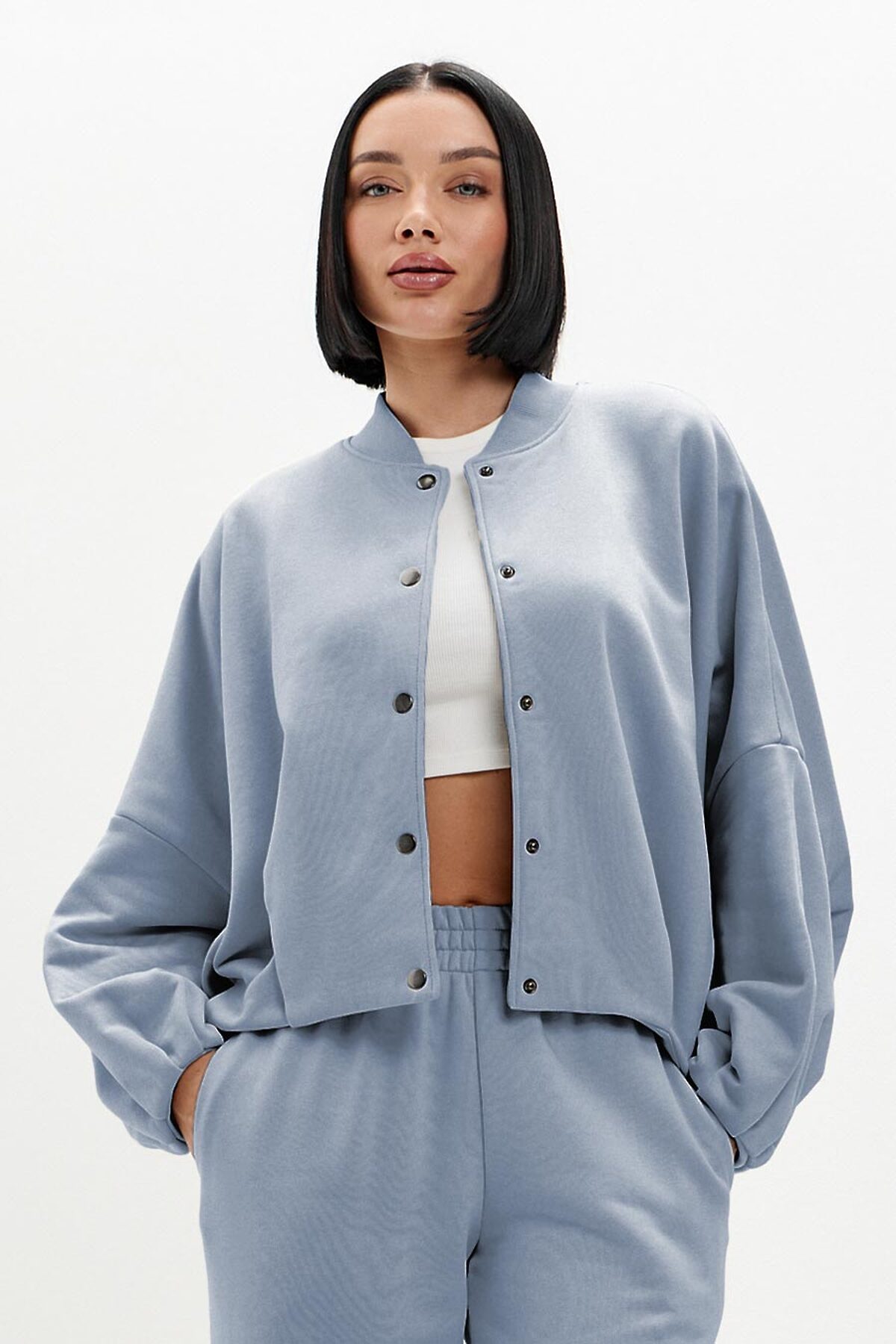 Модель оверсайз, с объемными рукавами силуэта "летучая мышь". Низ изделия и рукавов декорирован трендовой изящной складкой. Бомбер застегивается на кнопки, ворот выполнены из эластичного фактурного материала.