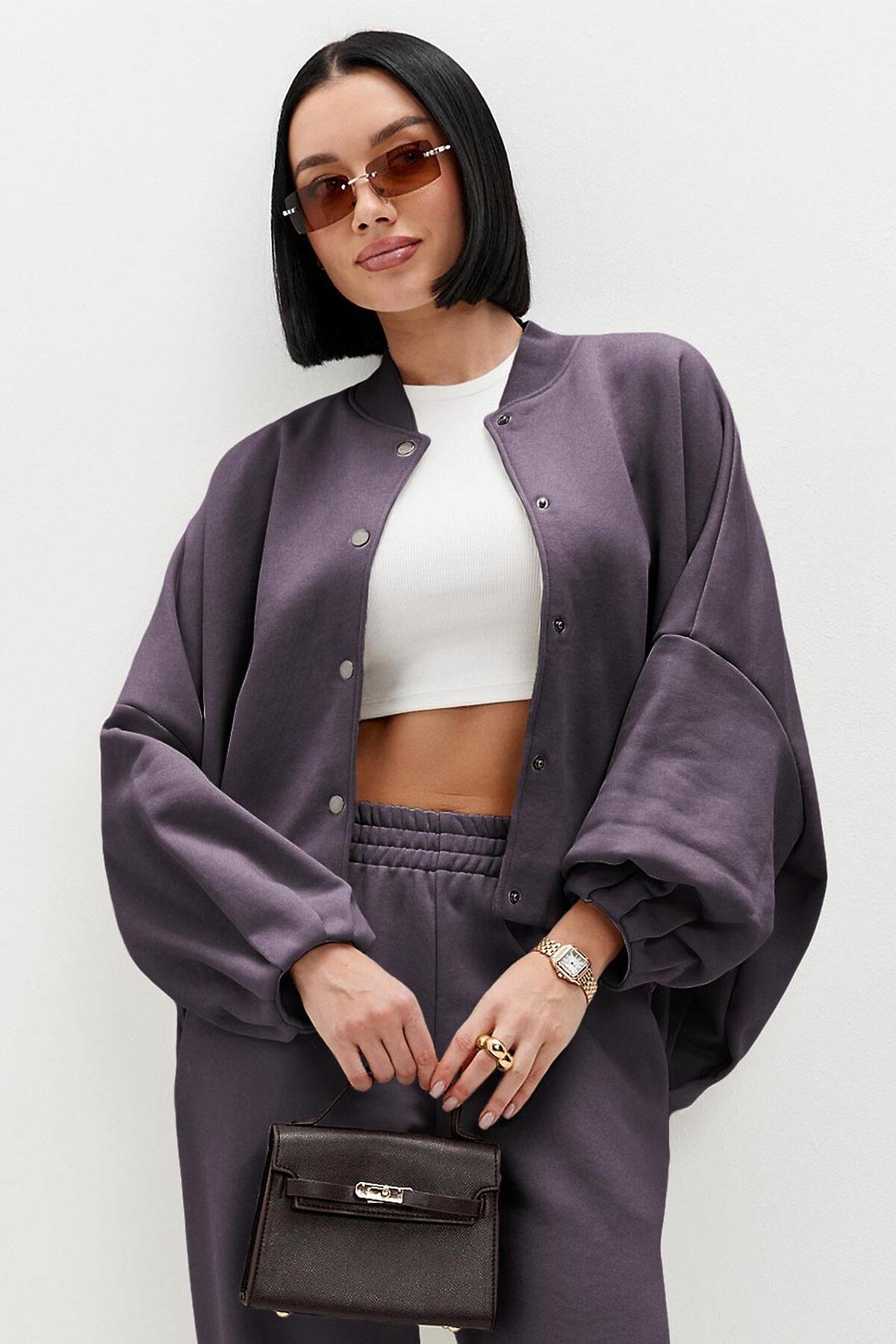 Модель оверсайз, с объемными рукавами силуэта "летучая мышь". Низ изделия и рукавов декорирован трендовой изящной складкой. Бомбер застегивается на кнопки, ворот выполнен из эластичного фактурного материала.