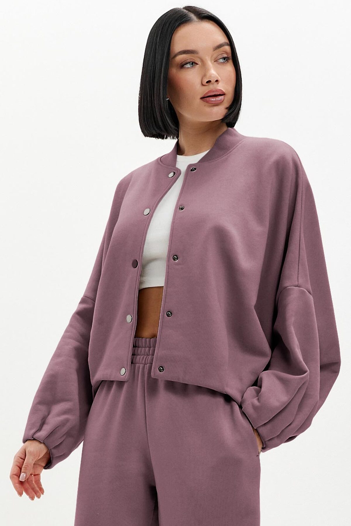 Модель оверсайз, с объемными рукавами силуэта "летучая мышь". Низ изделия и рукавов декорирован трендовой изящной складкой. Бомбер застегивается на кнопки, ворот выполнен из эластичного фактурного материала.