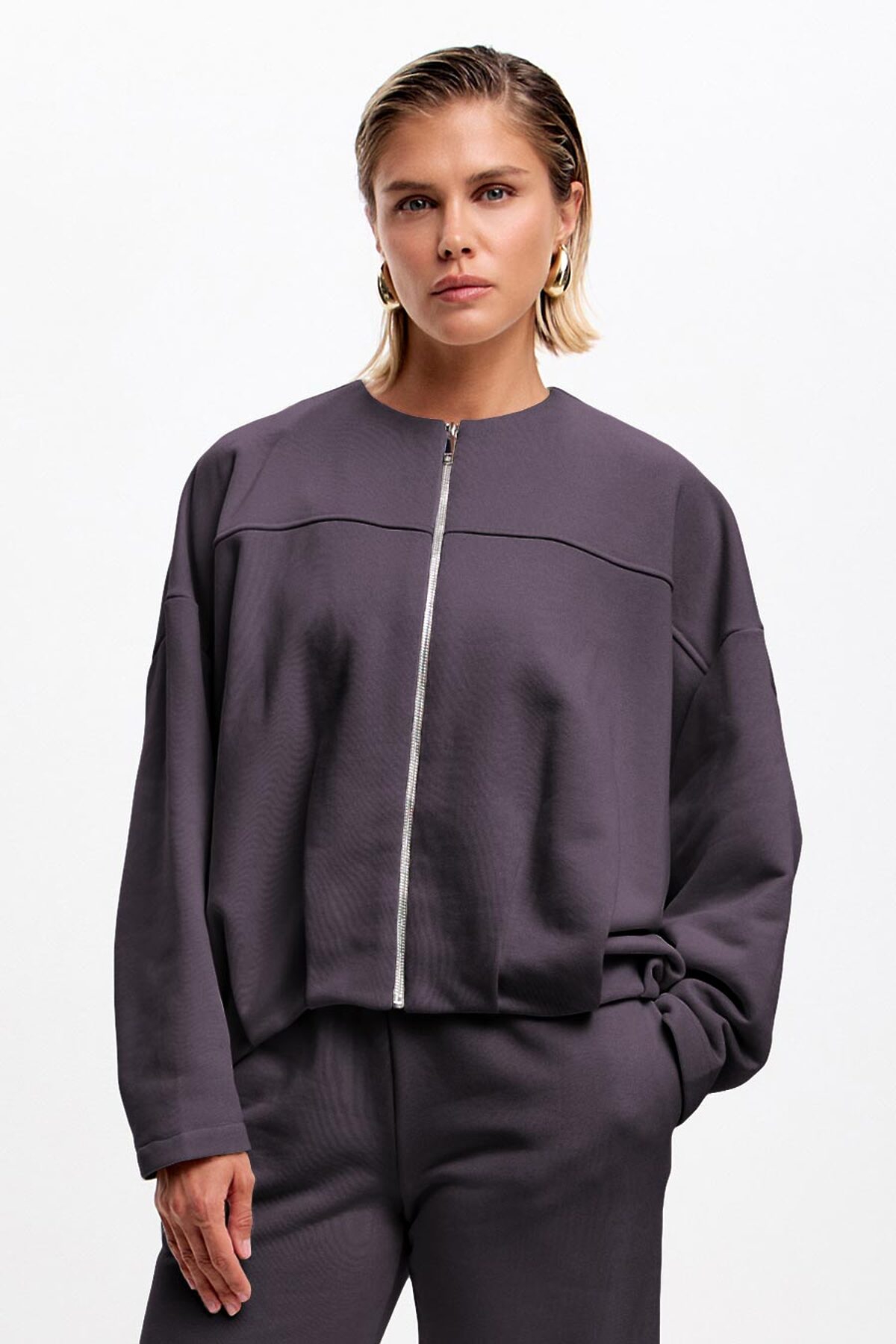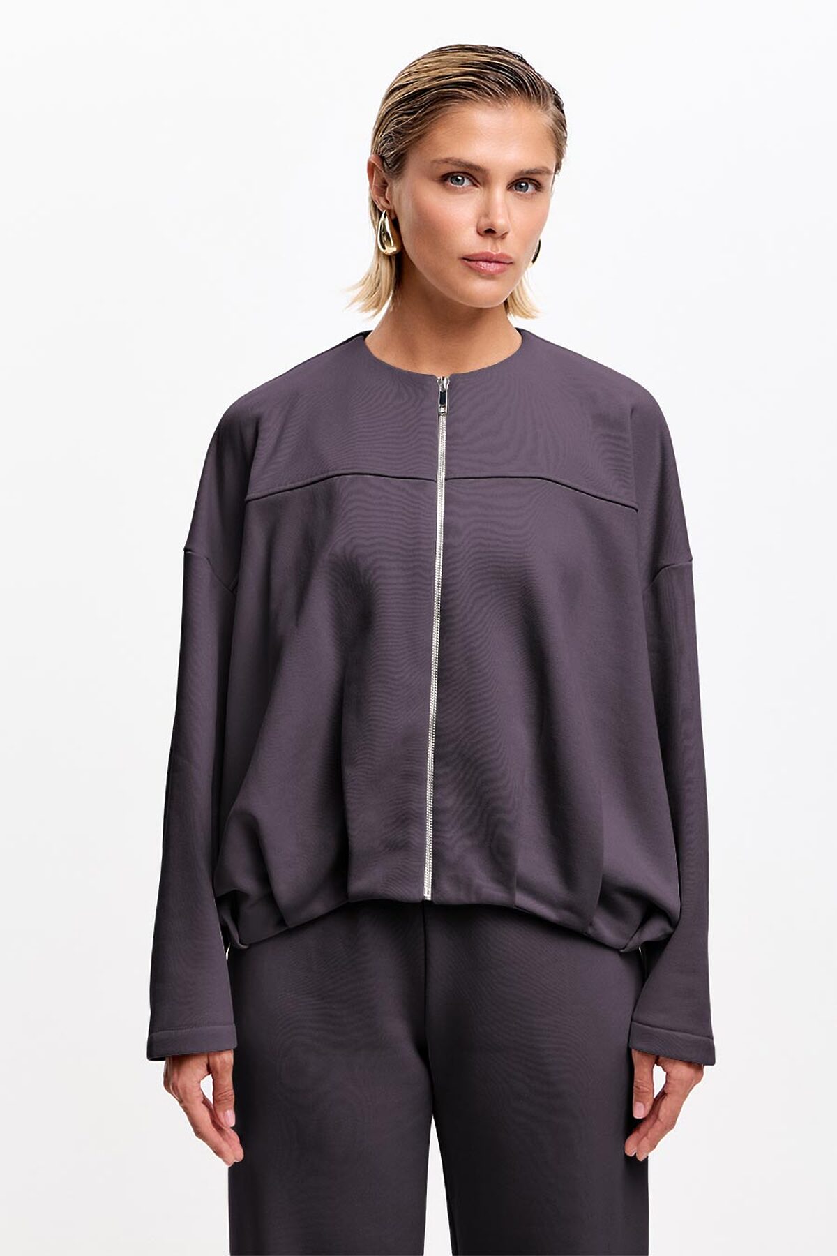 Модель оверсайз, с зауженными к запястью рукавами силуэта "летучая мышь". Низ изделия декорирован трендовой изящной складкой. Бомбер с круглым вырезом горловины, застегивается на разъемную молнию.