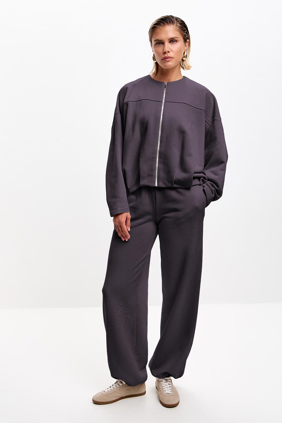 Модель оверсайз, с зауженными к запястью рукавами силуэта "летучая мышь". Низ изделия декорирован трендовой изящной складкой. Жакет с круглым вырезом горловины, застегивается на разъемную молнию.