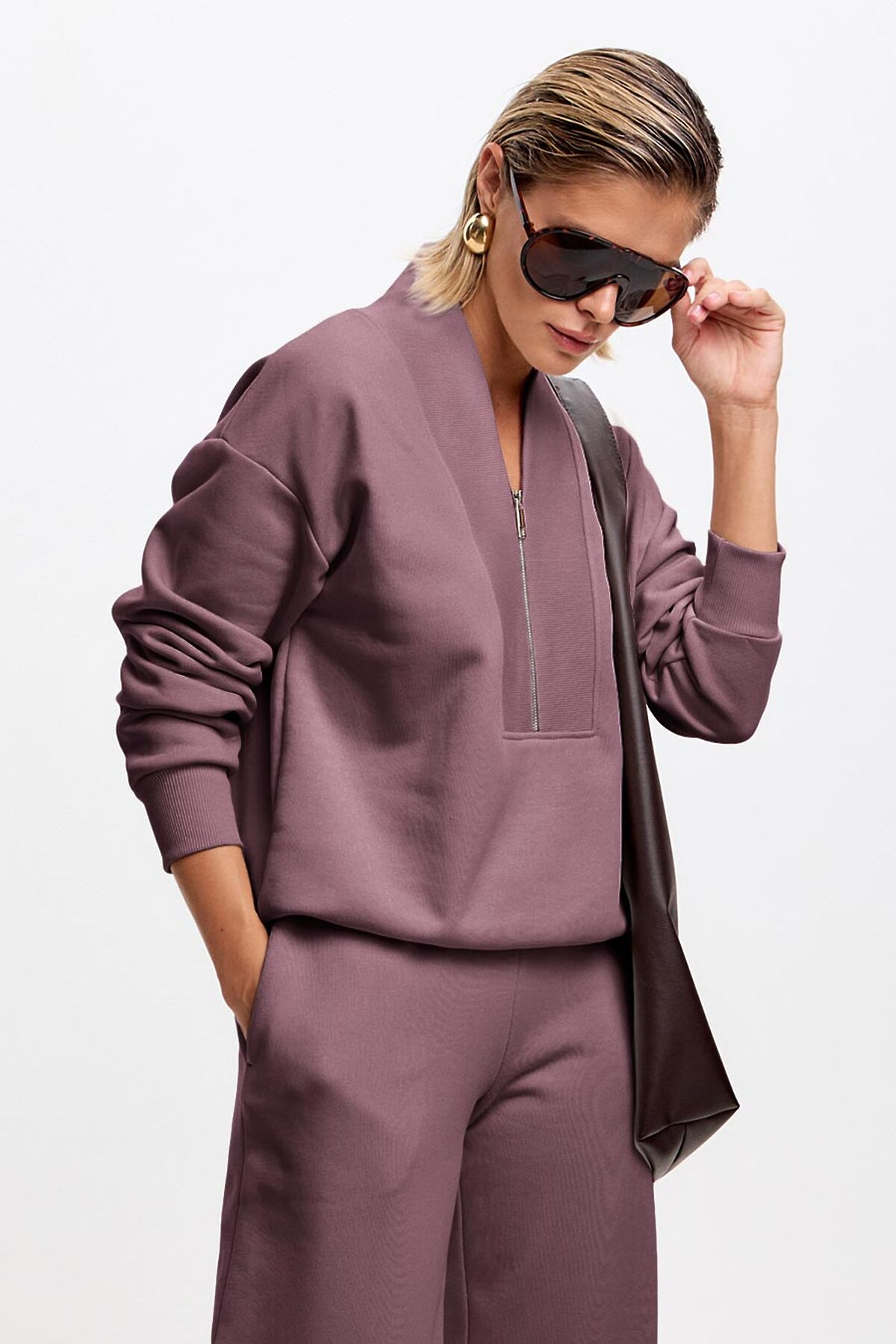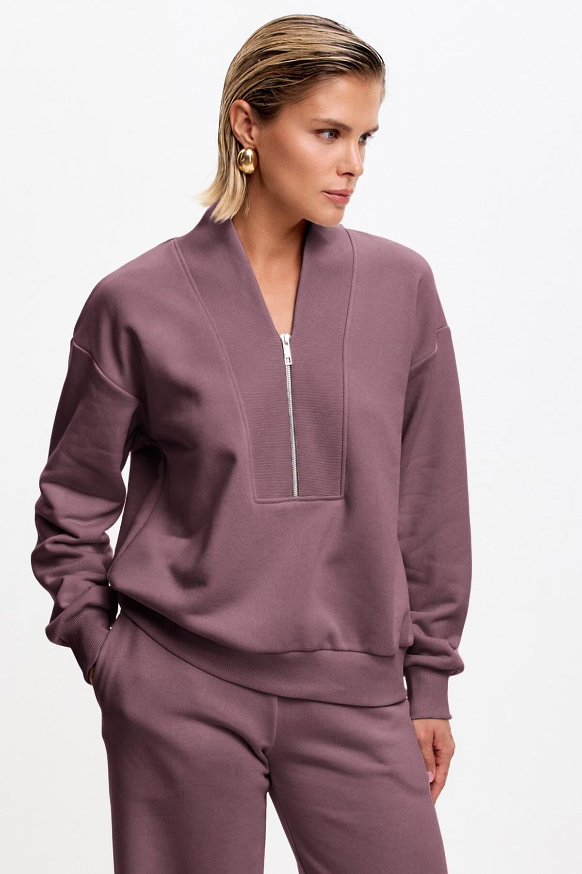 Свитшот свободного кроя, со спущенной линией плеча. Манжет и низ изделия выполнен из качественного эластичного материала в рубчик, декорирован брендированным шевроном. Оригинальный V-образный вырез на короткой металлической молнии.