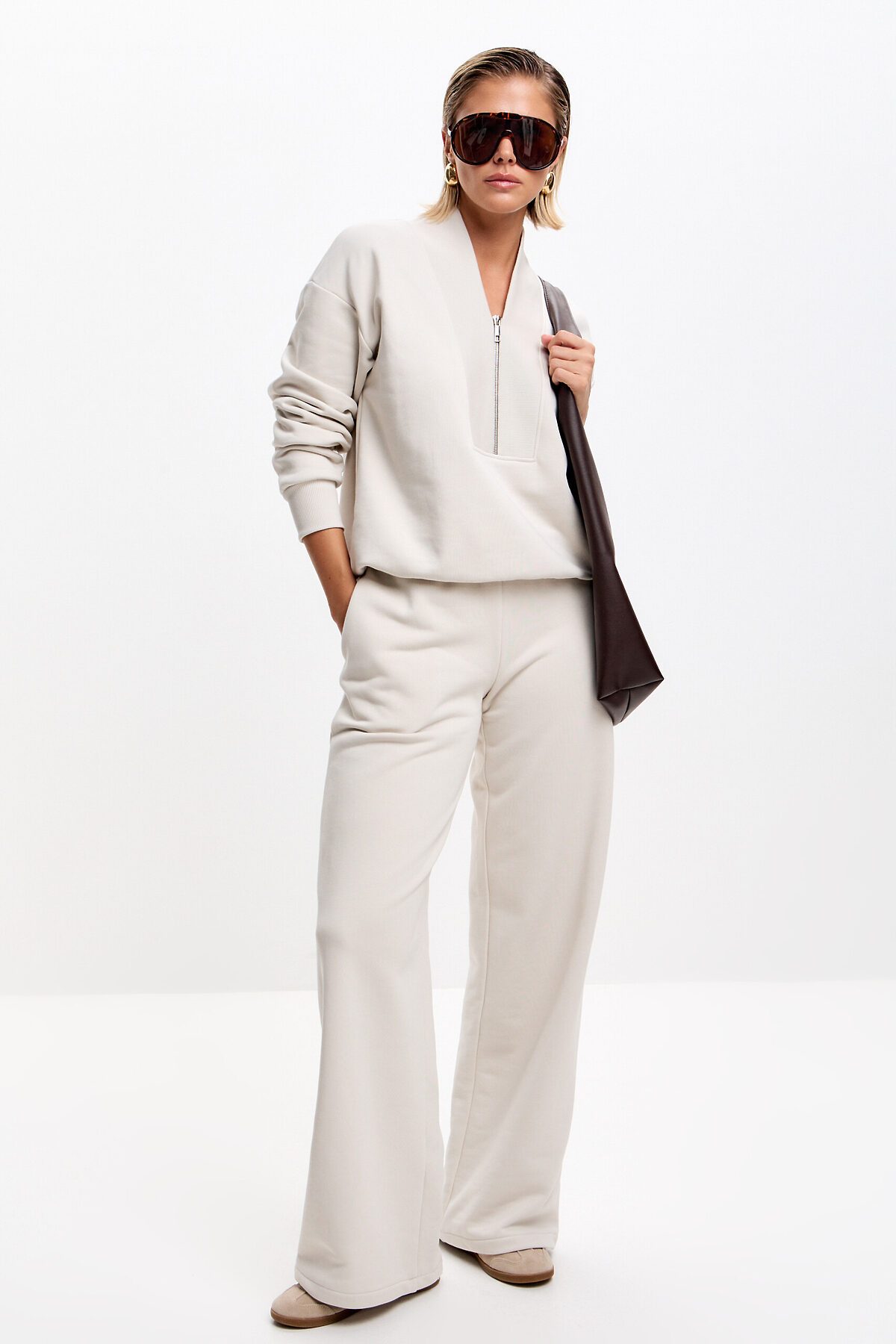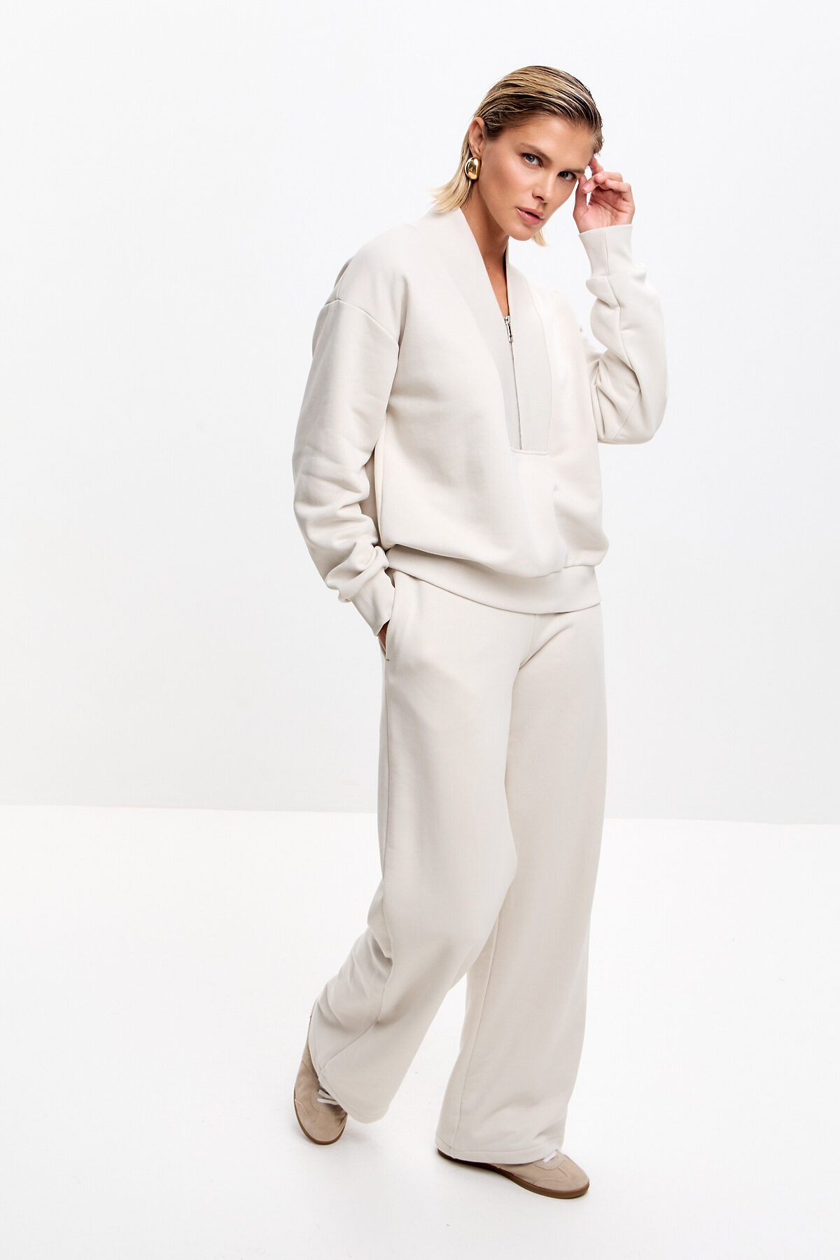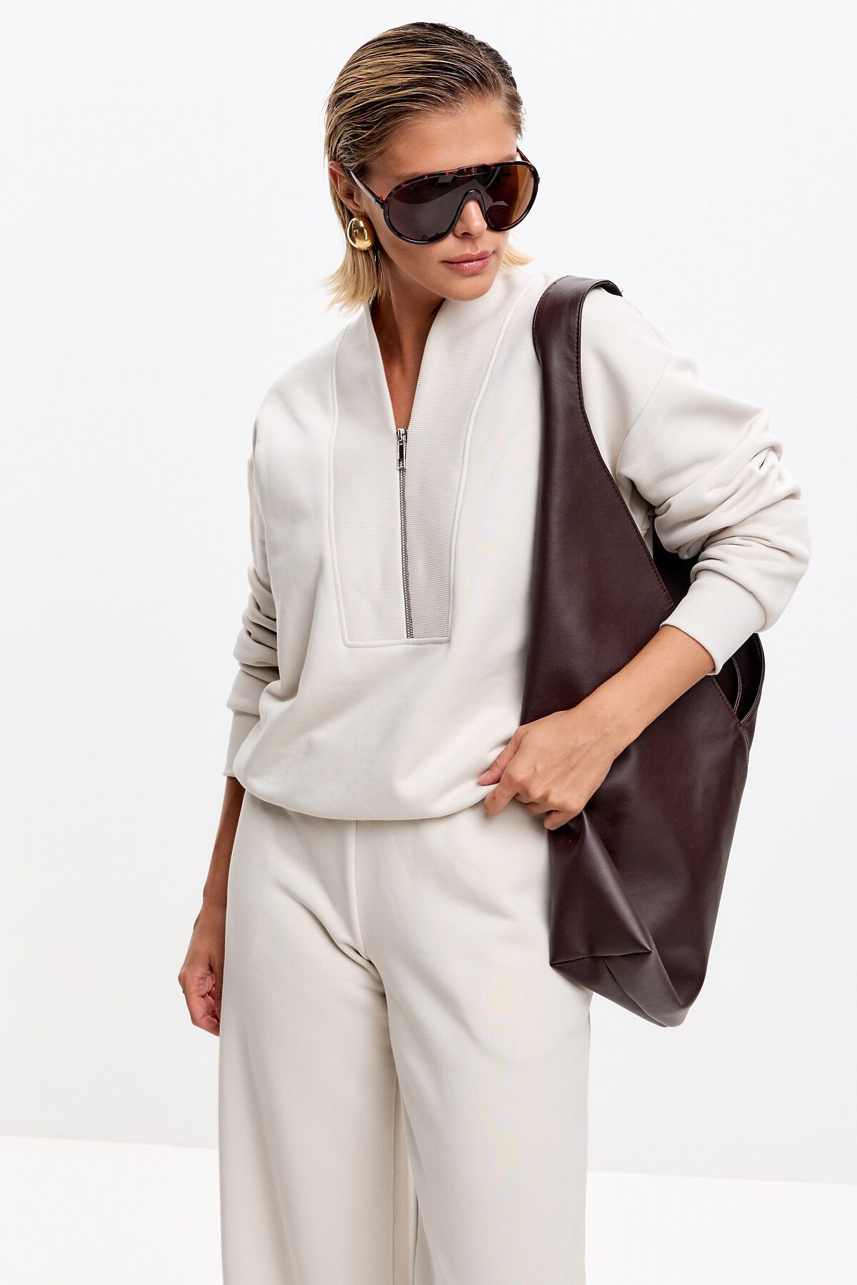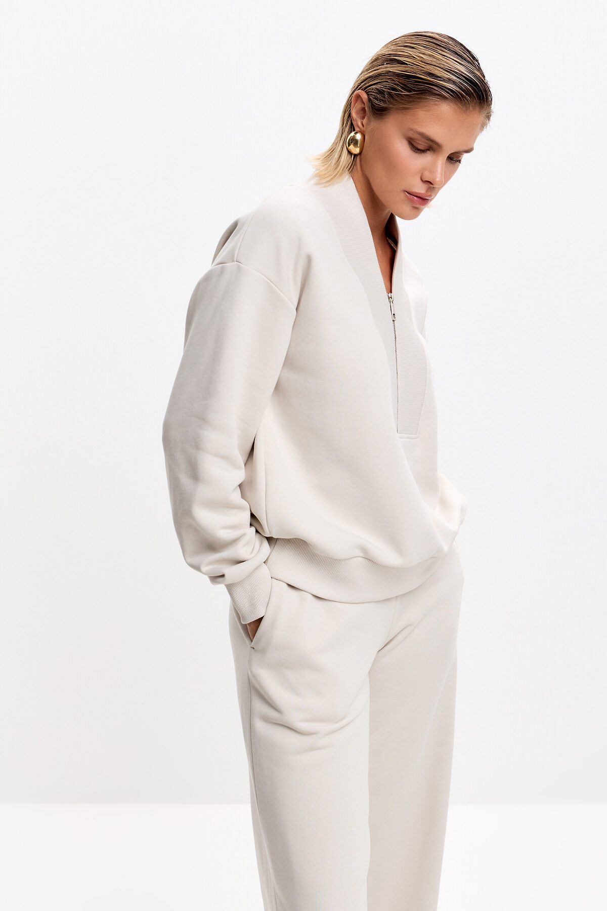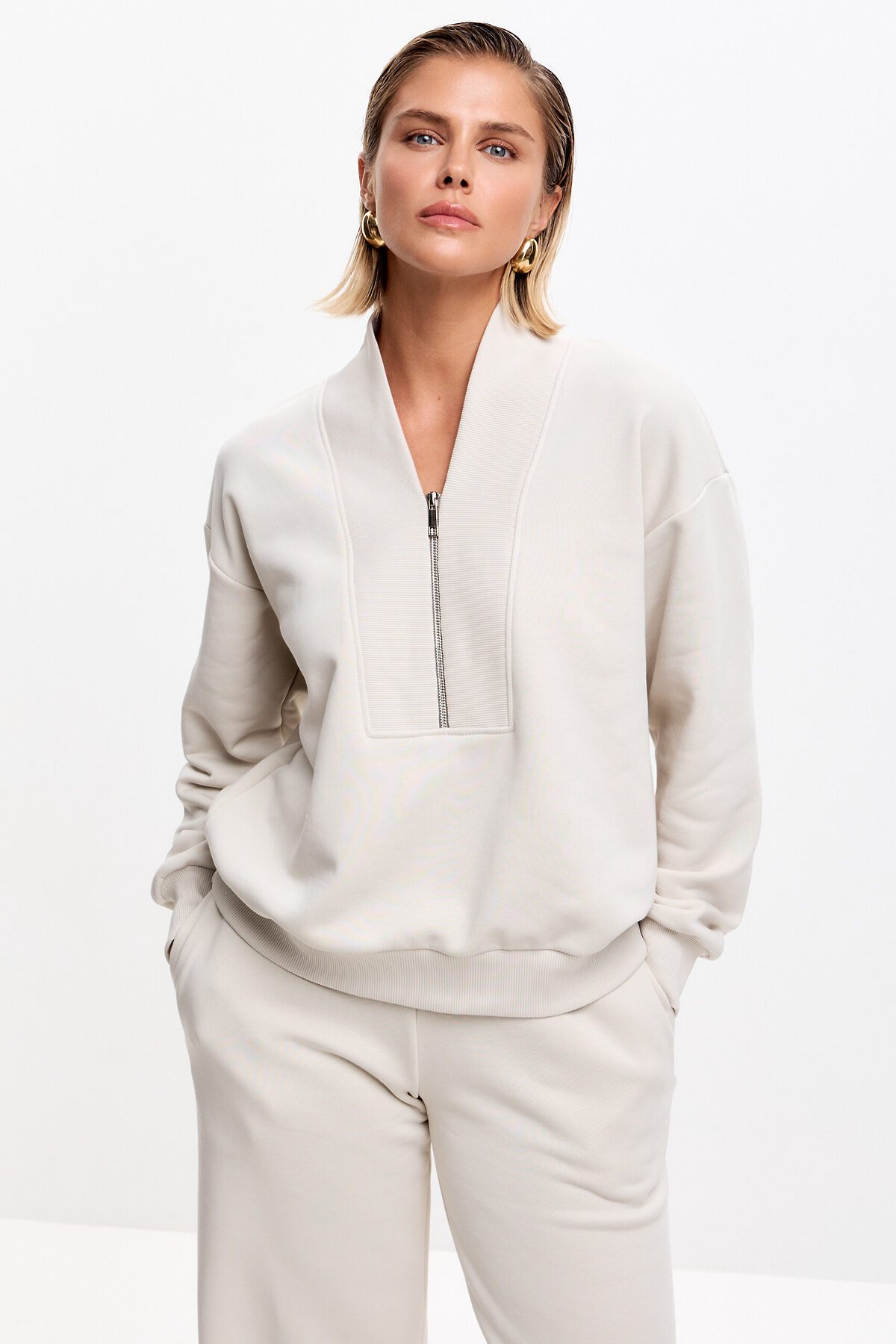 Свитшот свободного кроя, со спущенной линией плеча. Манжет и низ изделия выполнен из качественного эластичного материала в рубчик, декорирован брендированным шевроном. Оригинальный V-образный вырез на короткой металлической молнии.